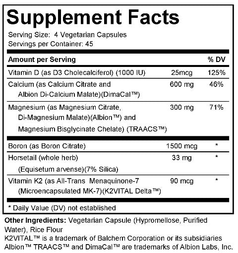 A full-spectrum, high-absorption chelated calcium and magnesium in a 2:1 ratio with vitamin D, and vitamin K2, plus silica and boron for supporting optimal bone health. Easy-to-swallow capsules.*